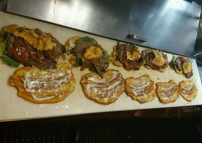 Your chef will take all the toppings of your Jibarito, place it on a top of a side of Arroz con Gandules topped fried tostones, and drizzled with garlic sauce.